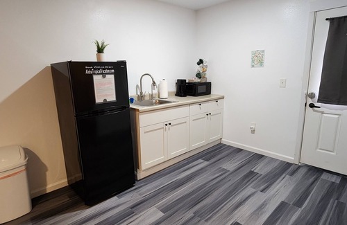 pillows, a comforter set, and a dining table that also serves as a workspace. Modern 100% Waterproof flooring, apartment-size refrigerator, kitchen sink, bathroom sink, dresser, and a wall-mounted coat hanger, toilet, shower, bedside table, and ceiling fan. For Guest Staying longer than 7 days or every 7 days, Lining Exchange Flat sheet, fitted sheet, a pillow slip. The iron and Ironing Board are located next to the tv if you need them.