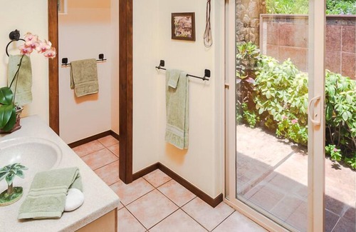 Tiled bathroom with large vanity opens up to your exotic private outdoor shower, surrounded by red lava rock walls and tropical plants.