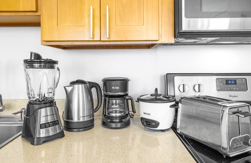 - Fully equipped with a toaster, coffee maker, rice cooker, blender, kettle, pots, pans, silverware, cookware, and dishes.