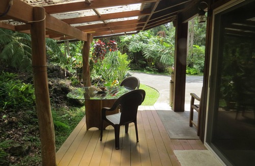 This 2 bedroom, 1 bath cottage is located at the bottom of a 6 acre parcel in the middle of the forest. The master bedroom has a king size bed, the second room has a Queen bed and there is a trundle bed in the living room. The ceilings are open beam cedar, the floors are bamboo and stone and the cottage has many custom details. The bathroom has a large custom walk in shower. Outside there is a covered lanai with a nice table and seating as well as an outdoor soaking tub surrounded by flower gardens and forest. Private and secluded but 10 minute drive to the beach 15 into Kona town