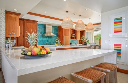 The award-winning Henderson Design Group has wholly redone this stunning 4 bedroom, 4.5 bath estate, and it is a feast for the senses. Located at the Hualalai Resort at Hualalai, the decor, furnishings, fixtures, and finishes are contemporary, opulent, and chic, evoking the island vibe with masterful skill. This home is outfitted with all the latest technology essentials, including lightning fast WiFi and a Sonos wireless home sound system. A dedicated media room, and workstations in the kitchen and primary bedroom ensure all your office and school requirements are easily accomplished. Individual climate control in each room and abundant ceiling fans ensure your absolute comfort day and night.