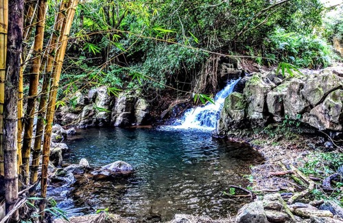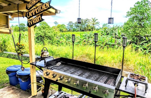 This rental offers two queen-size beds with beautiful garden views and is located near Akaka Falls in Hawaii. Guests can relax in the comfortable bedroom that features banana, sugar cane, and eucalyptus plantation views, and has a closet and a dresser. The glamping rental in which it is situated has a shared bathroom and a shared full kitchen for guests to prepare romantic meals together. They will also have access to the common living room that has a TV with Netflix already set up—perfect for evenings spent snuggling on the sofa together. The glamping accommodation also has a common dining room and a washing machine as well as a covered clothesline to hang dry clothes. Guests will also have access to the Wi-Fi. The main rental on the glamping site has a bathroom with a shower for guests to use, in addition to an outdoor kitchen with a BBQ grill and a community fire pit.
