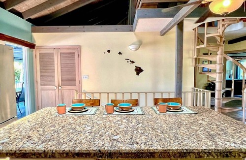 Kaloli Sunrise is a two story house with all the living areas on the second floor. The ground floor has a garage and laundry room, both for your use. The house has two bedrooms and hosts up to five guests. The primary bedroom has a large, four poster California king size bed, ensuite bathroom with two sinks, and a walk-in shower. The guest bedroom has a queen size bed and an XL twin bed. The second full bathroom is near the guest bedroom. There are all the pots, pans, utensils, and dishes that you would need to cook and enjoy local produce in the kitchen.