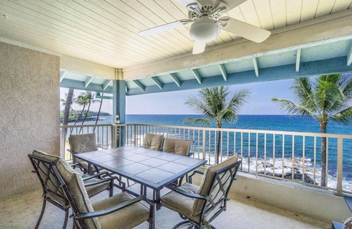 Sit back and relax on your own private ocean front lanai and take in some of the best views on the Kona Coast. 2 bedrooms 2 full baths, one king bed, 1 queen are included in this spacious condo that boasts ocean views from every room. Central A/C, Sony TV, DVD, wireless internet available and a well appointed kitchen are just a few of the wonderful amenities guests will enjoy.