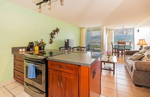 Note: This building has a stunning, 20-story, open air view of Diamond Head and the ocean from the exterior walkway (see photo) that leads to the condo. If you have a fear of heights, please take this into consideration before reserving this property.