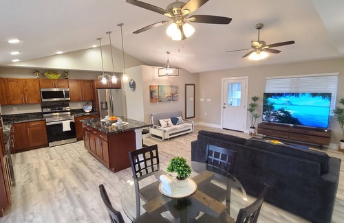 The room has been recently furnished with brand-new amenities: King-size bed with 14" Comfort Memory Foam Mattress, 3-seat super comfy Fabric Sofa, Large Kitchen with all the appliances and cooking wares, 75" smart TV in the living room and 50" smart TV in the bedroom, Large breakfast countertop, 300M Fiber high-speed Wifi, metal framed full size sofa bed in the living room for an additional person to sleep and many more items.