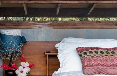 Wake up eye-level with the canopy in a lofted bedroom with floor-to-ceiling windows and traditional furnishings. Nestled among forest and rich with daylight, this tropical hideaway offers an unmatched open-air environment with eclectic adornment.