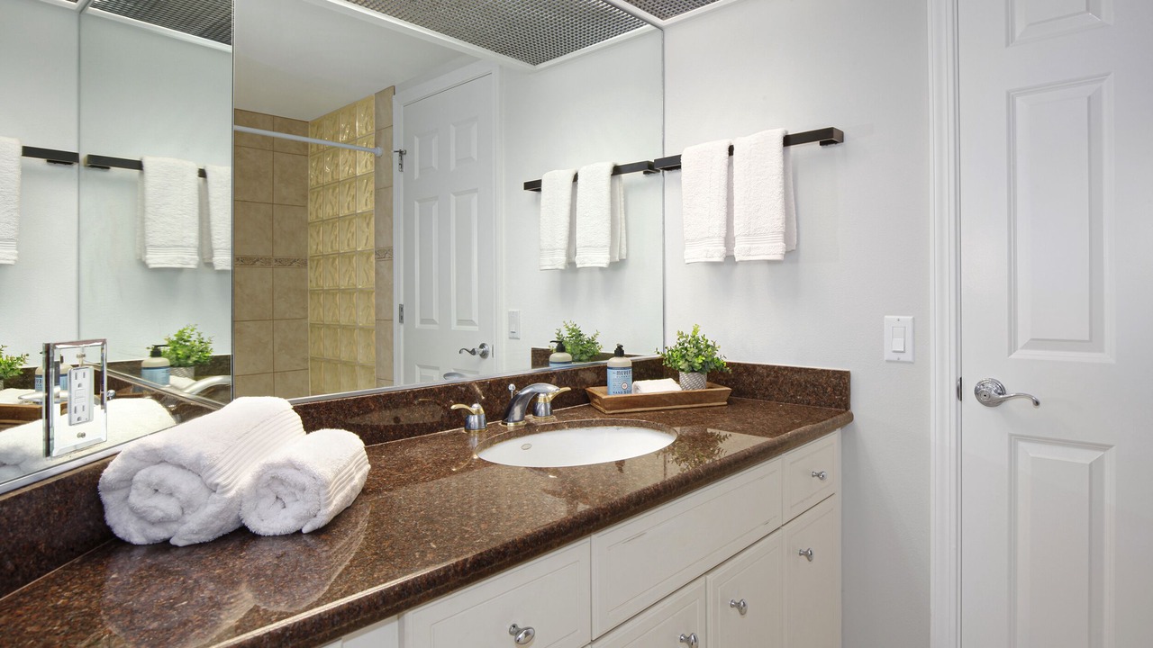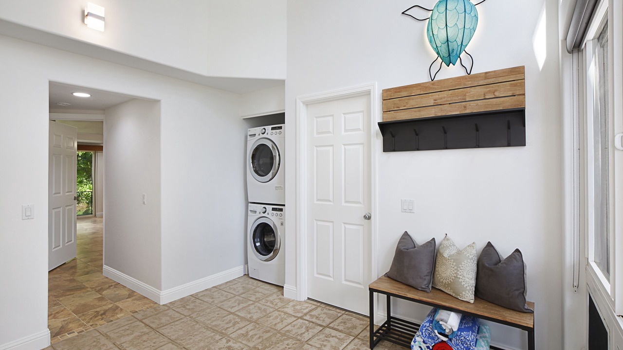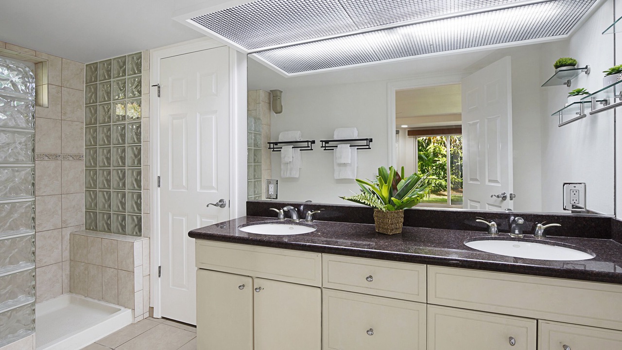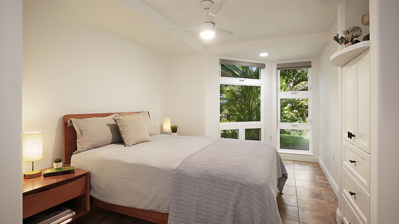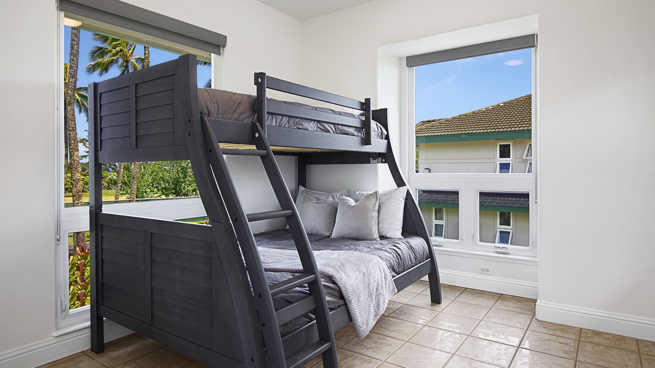 The spacious primary bedroom is furnished with a luxurious king bed, ceiling fan, direct access to the back lanai (porch) with stunning garden views, and a private ensuite with dual vanities and a walk-in shower. Guest bedroom 2 has a queen bed, ceiling fan, garden views, and a private ensuite with a large vanity and tub-shower. Guest bedroom 3 features a twin-over-full bunk bed, ceiling fan, garden views and access to the shared bathroom with a walk-in shower. Unit has a full-size modern LG washer and dryer.