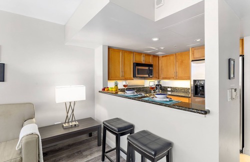 For your convenience and comfort, this corner unit on the opposite side of Ala Moana Blvd (The cool, quiet side) has a central air-conditioned unit with a fully equipped kitchen, along with a dining countertop for up to two people and a dining table for 2. The bedroom has a king-size bed, while the living room area sports a pull-out queen-size sleeper sofa and a 55'' Samsung Smart TV. To top it all off, the condo features a full bathroom with a walk-in shower as well.