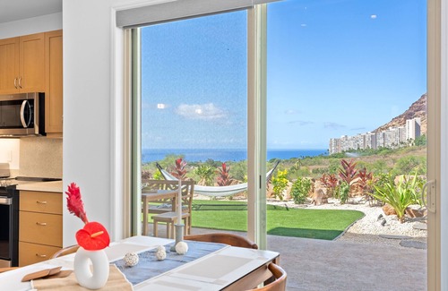Kick back in the heart of Makaha Valley at Mauna View, a 3-bedroom retreat that blends modern design with a stunning backdrop of lush mountains. With oversized windows, tasteful organic décor, and warm leather seating, the living space invites you to unwind in style. Host movie nights on the flat-screen TV, enjoy meals with a view from the dining table, or prepare island-inspired dishes in the fully equipped kitchen with barstool seating and sleek appliances.